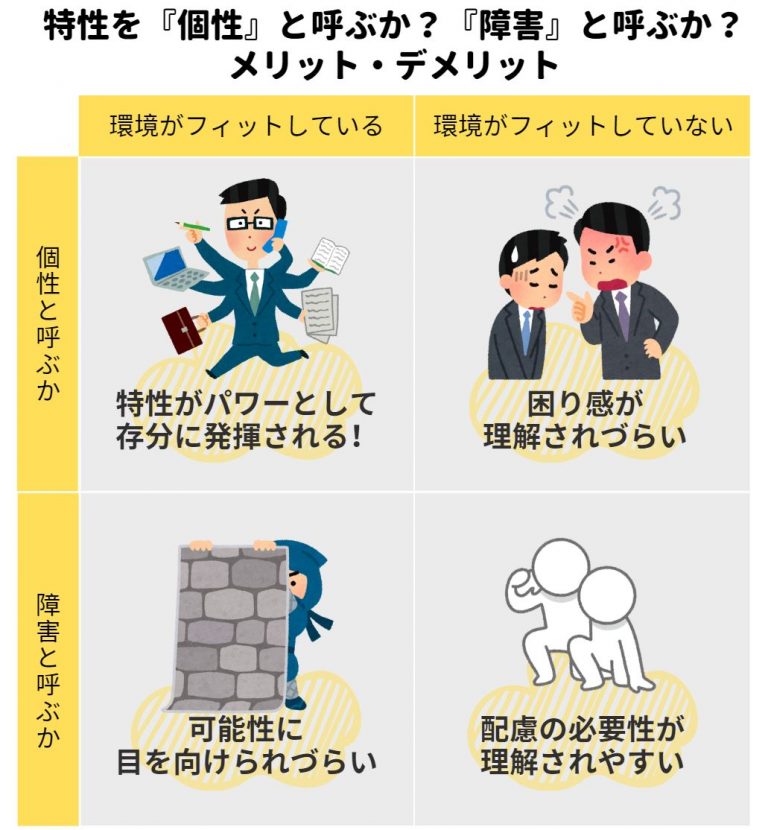 あなたにとって、その特性がプラスに働く環境にいられるのであれば、愛をこめて『個性』と呼びましょう。もし、マイナスに働く環境にいるのであれば『障がい』と表現してその困り感を周りの人に伝えましょう。そうすると、周囲の人に理解してもらうための手助けとなるでしょう。