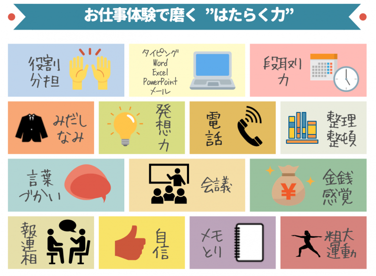 お仕事体験では、この「はたらく力」が求められるような具体的な状況を作り出し、実践を繰り返していく中でソフトスキルの習得を目指していきます。