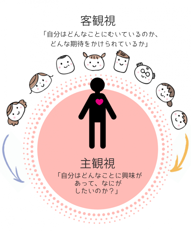 - 「自分はどんなことに興味があって、どんな仕事につきたいのか?」といったような潜在的なニーズと向き合う主観視。